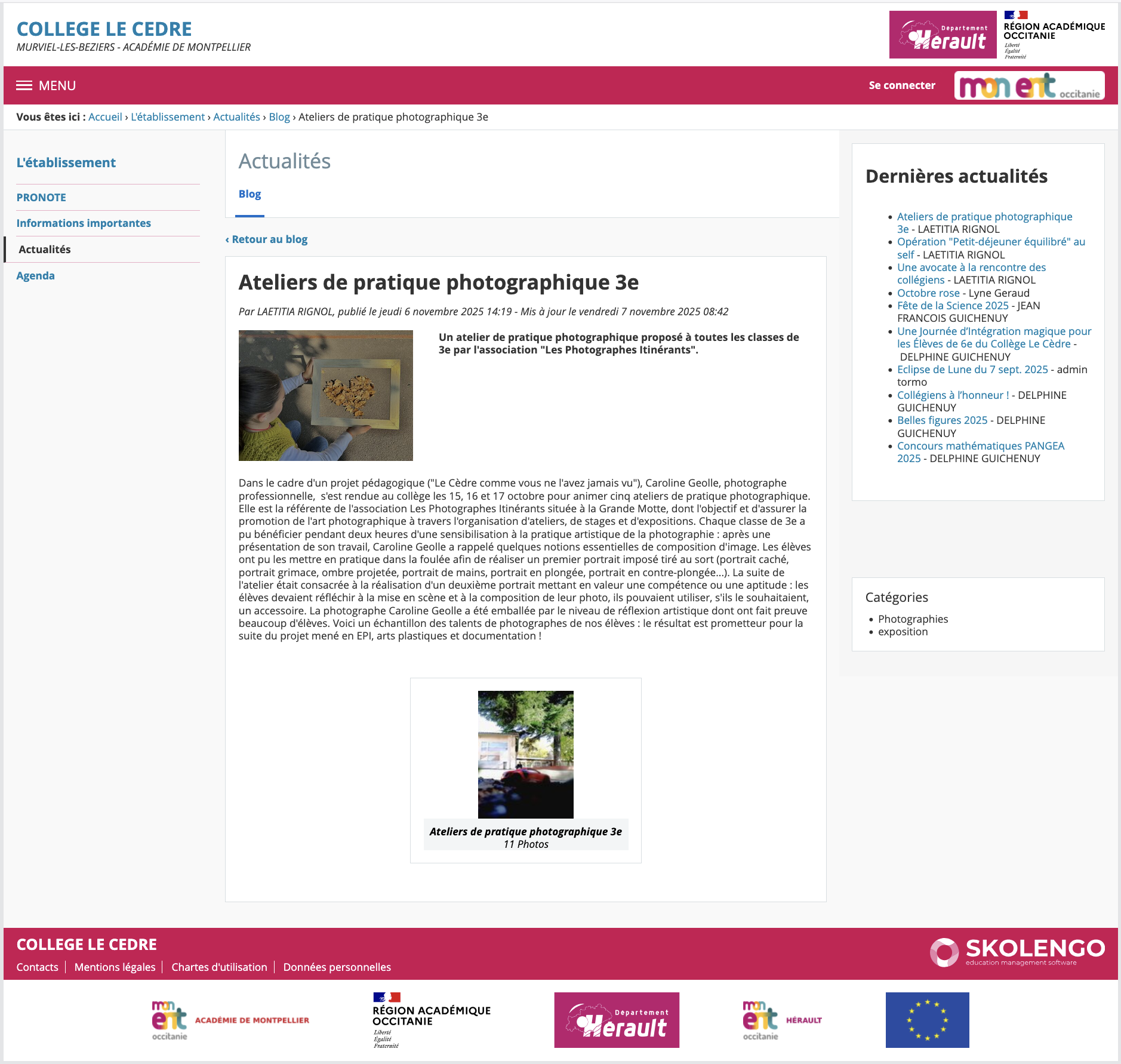 Dans le cadre d’un projet pédagogique (« Le Cèdre comme vous ne l’avez jamais vu »), Caroline Geolle, photographe professionnelle, s’est rendue au collège les 15, 16 et 17 octobre pour animer cinq ateliers de pratique photographique. Elle est la référente de l’association Les Photographes Itinérants située à la Grande Motte, dont l’objectif et d’assurer la promotion de l’art photographique à travers l’organisation d’ateliers, de stages et d’expositions. Chaque classe de 3e a pu bénéficier pendant deux heures d’une sensibilisation à la pratique artistique de la photographie : après une présentation de son travail, Caroline Geolle a rappelé quelques notions essentielles de composition d’image. Les élèves ont pu les mettre en pratique dans la foulée afin de réaliser un premier portrait imposé tiré au sort (portrait caché, portrait grimace, ombre projetée, portrait de mains, portrait en plongée, portrait en contre-plongée…). La suite de l’atelier était consacrée à la réalisation d’un deuxième portrait mettant en valeur une compétence ou une aptitude : les élèves devaient réfléchir à la mise en scène et à la composition de leur photo, ils pouvaient utiliser, s’ils le souhaitaient, un accessoire. La photographe Caroline Geolle a été emballée par le niveau de réflexion artistique dont ont fait preuve beaucoup d’élèves. Voici un échantillon des talents de photographes de nos élèves : le résultat est prometteur pour la suite du projet mené en EPI, arts plastiques et documentation !