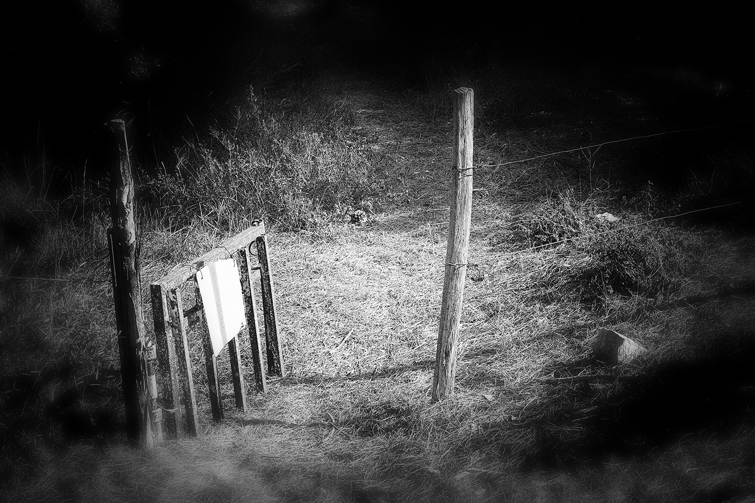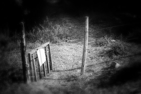 Ta photo respire le mystère, tu as réussi le défi ! Tu choisis un point de vue en plongée qui amène le regard directement sur cette partie très claire de ta photo juste après le portail dont l’ouverture et la ligne de fuite nous guide vers cet endroit, comme pour dire qu’il s’y est passé quelque chose, mais quoi ? Le mystère est là, à cet endroit précisément ! tous les éléments de ta composition sont à leur place et ainsi, permette à l’œil d’être concentré sur le mystère ! Notons des élements essentiels qui apporte à ta narration l’idée du mystère, le panneau blanc accroché au portillon, l’ombre verticale qui coupe ce même panneau blanc, quelle est l’information du panneau ? Mystère ! Et les ombres rectilignes sur le sol semblant être la projection des barreaux du portillon et pourtant, il en manque, n’est ce pas ? Pour finir, le post-traitement que tu appliques pour amplifier cette idée du mystère avec l’obscurité du fond et le floutage sur le devant de ta photo, donnant le choix au spectateur de se demander où est passée le mystère qui se tenait là, sur la clarté du sol écrasé ? Vers l’obscurité ou vers le flou ?